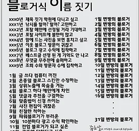 <이름짓기 시리즈> 블로거식 이름 짓기! 블로거식 이름 짓기! 포스팅 입니다. ^ㅡ^ 최근 인터넷 공간을 통해 이름 짓기 시리즈가 유행 하고 있습니다. 이름 짓기 시리즈로는 인디안식 이름 짓기, 중세식 이름 짓기, 조선식 이름 짓기, 일본식 이름 짓기, 공대생식 이름 짓기, 축구식 이름 짓기, 정치인식 이름 짓기 등 다양한 이름 짓기로 우리에게 재미를 주고 있습니다. 그러던 중에 '블로거식 이름 짓기'가 있으면 재밌겠다는 생각을 해서 찾아보니 없기에 제가 직접 만들었습니다. 블로거의 생각의 공감대 안에서 그냥 웃자고 만든 내용이니 유머로만 받아 드려 주시길 바랍니다 ^ㅡ^;; 블로거식 이름 짓기를 하기 전에 손가락 추천 한 번 부탁드릴게요. +_+ ㄳ XXX0년 제목 짓기 학원에 다니고 싶고 XXX1년 낚시를 할까? 말까? 고민하고 XXX2년 .. 더보기 이전 1 ··· 963 964 965 966 967 968 969 ··· 1194 다음